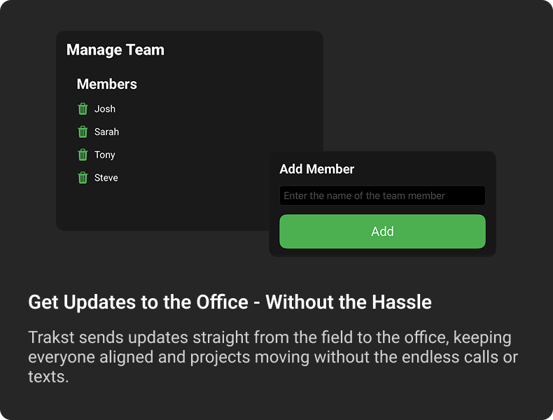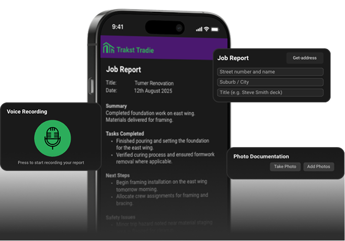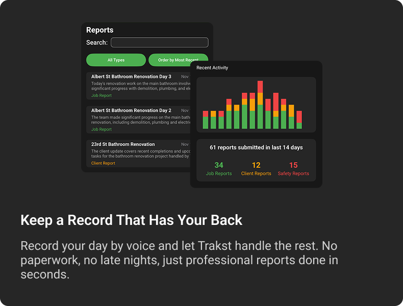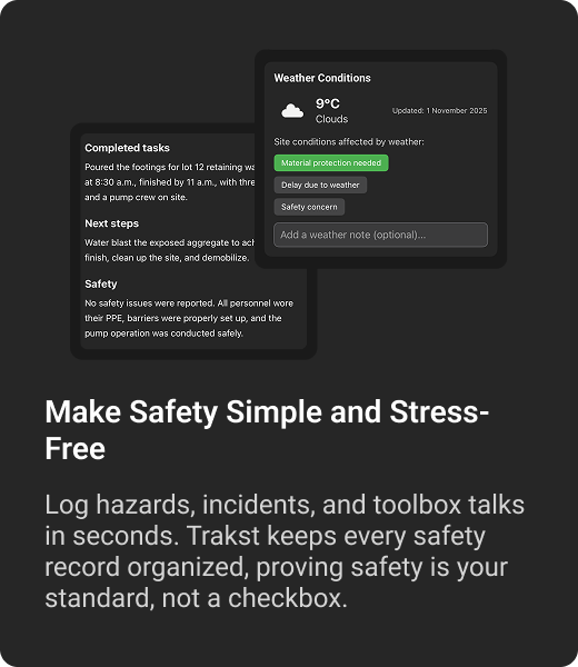 Trakst was created to simplify the way construction firms and independent tradies manage their daily reporting. From daily reporting to safety logging to progress tracking, we provide digital tools that replace paperwork and bring real-time visibility into every project.