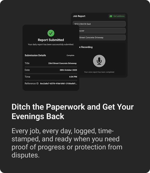 Turn your voice into polished site reports in seconds – save hours, avoid disputes, and keep your projects moving. Join the waitlist today. Secure your spot today